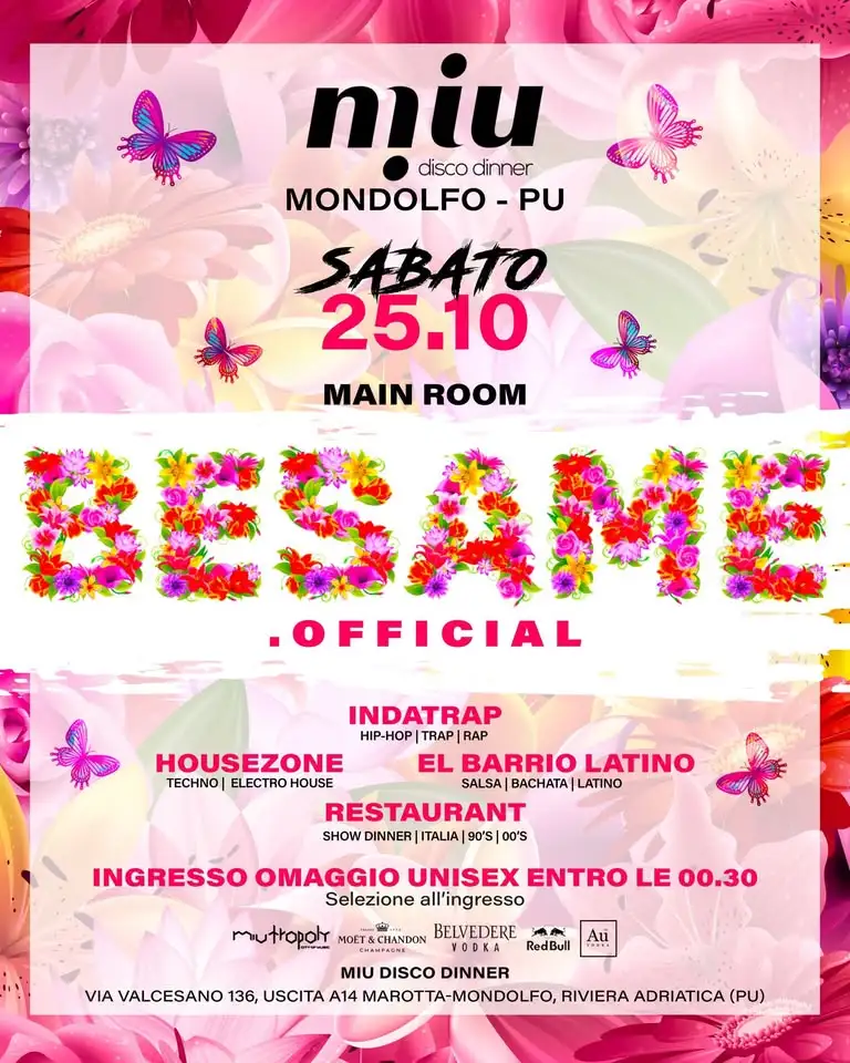 Unisciti a noi per l’evento imperdibile BESAME – Summer Tour al Miu Disco Dinner il 5 ottobre. Sperimenta una notte di musica con diversi generi: dalla reggaeton ai ritmi Latino, fino al trap e house. Goditi una cena spettacolare con piatti italiani e i successi degli anni ’90 e 000. L’ingresso è omaggio fino a mezzanotte e mezza, con drink inclusi a 15 euro dopo. Prenota il tuo tavolo e preparati a ballare fino all’alba. Ti aspettiamo in via Valcesano 136, Mondolfo!