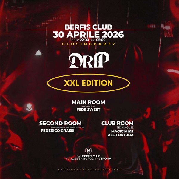 Giovedì 30 aprile 2026 il Berfi s Club di Verona ospita il Drip XXL closing party per una notte tra dance e reggaeton con energia in pista