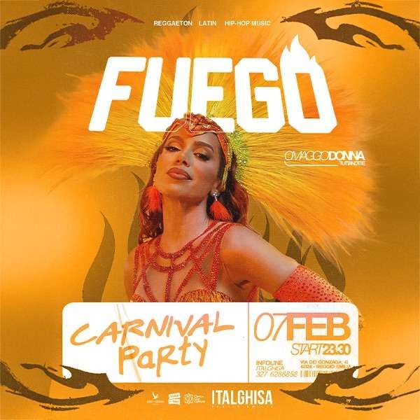 Sabato 7 febbraio 2026 Fuego – Carnival Party Italghisa Reggio Emilia una serata dal vibe tropicale ritmi calienti e atmosfera da vera spiaggia brasiliana