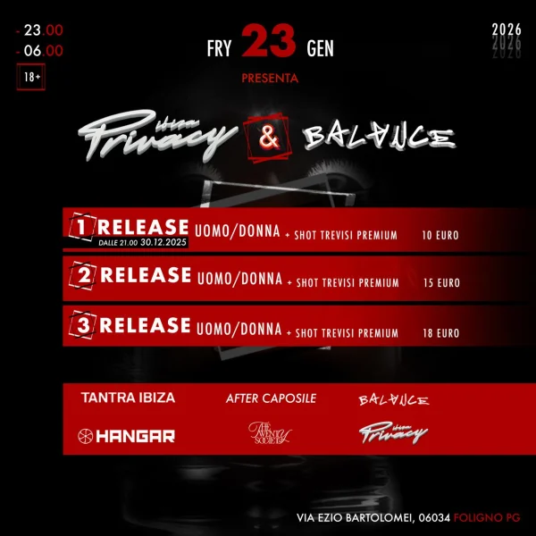 Venerdì 23 Gennaio 2026 Hangar Foligno ti aspetta per IBIZA PRIVACY & BALANCE