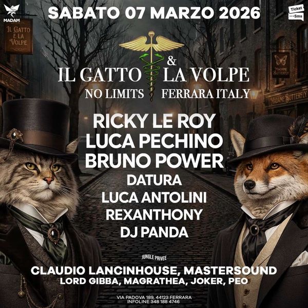 Sabato 07 marzo vivi Il Gatto e La Volpe W/ Bruno Power Ricky Le Roy Luca Pechino al Madame Butterfly una notte house energia e divertimento