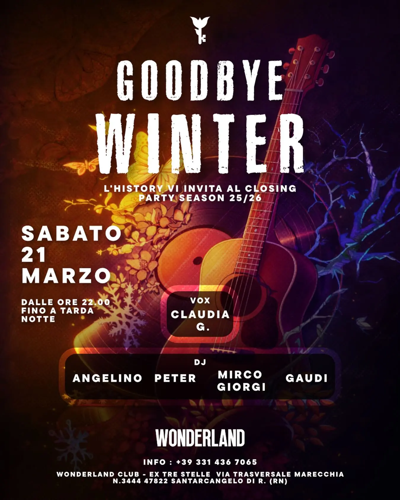 Il momento tanto atteso è finalmente arrivato. L’inverno sta finendo e la primavera bussa alla porta. Segnati subito questa data sul calendario. Il 21 marzo 2026 Goodbye Winter trasformerà la tua notte. Il celebre wonderland club è pronto ad accoglierti per un evento epico.