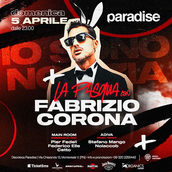 Partecipa all evento La Pasqua al Paradise con Fabrizio Corona presso Paradise di Montereale Valcellina per una notte dance commerciale house indimenticabile