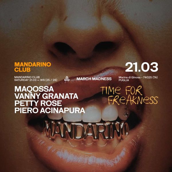 Sabato 21 marzo Discoteca Mandarino Club di Marina di Ginosa ospita March Madness w Maqossa vivi una notte unica con Maqossa Vanny Granata Petty Rose Piero Acinapura e musica dance techno