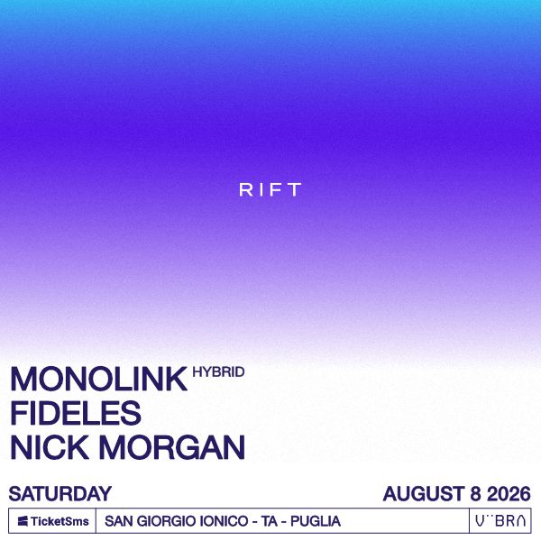 Sabato 8 agosto 2026 il Rift Club di San Giorgio Jonico ospita Monolink Fideles e Nick Morgan per una notte elettronica e house con grande energia e divertimento assicurato