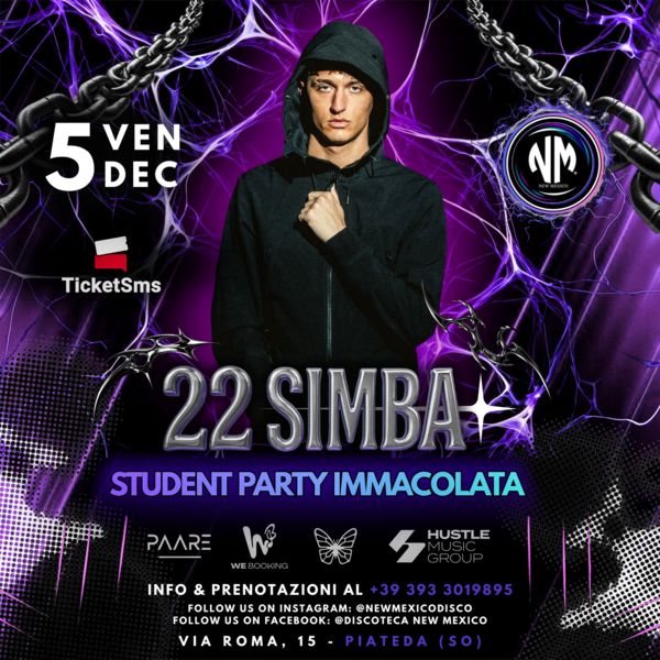 Venerdì 5 dicembre Student Party Immacolata 22Simba alla Discoteca New Mexico Piateda una serata di musica hip hop energia e divertimento