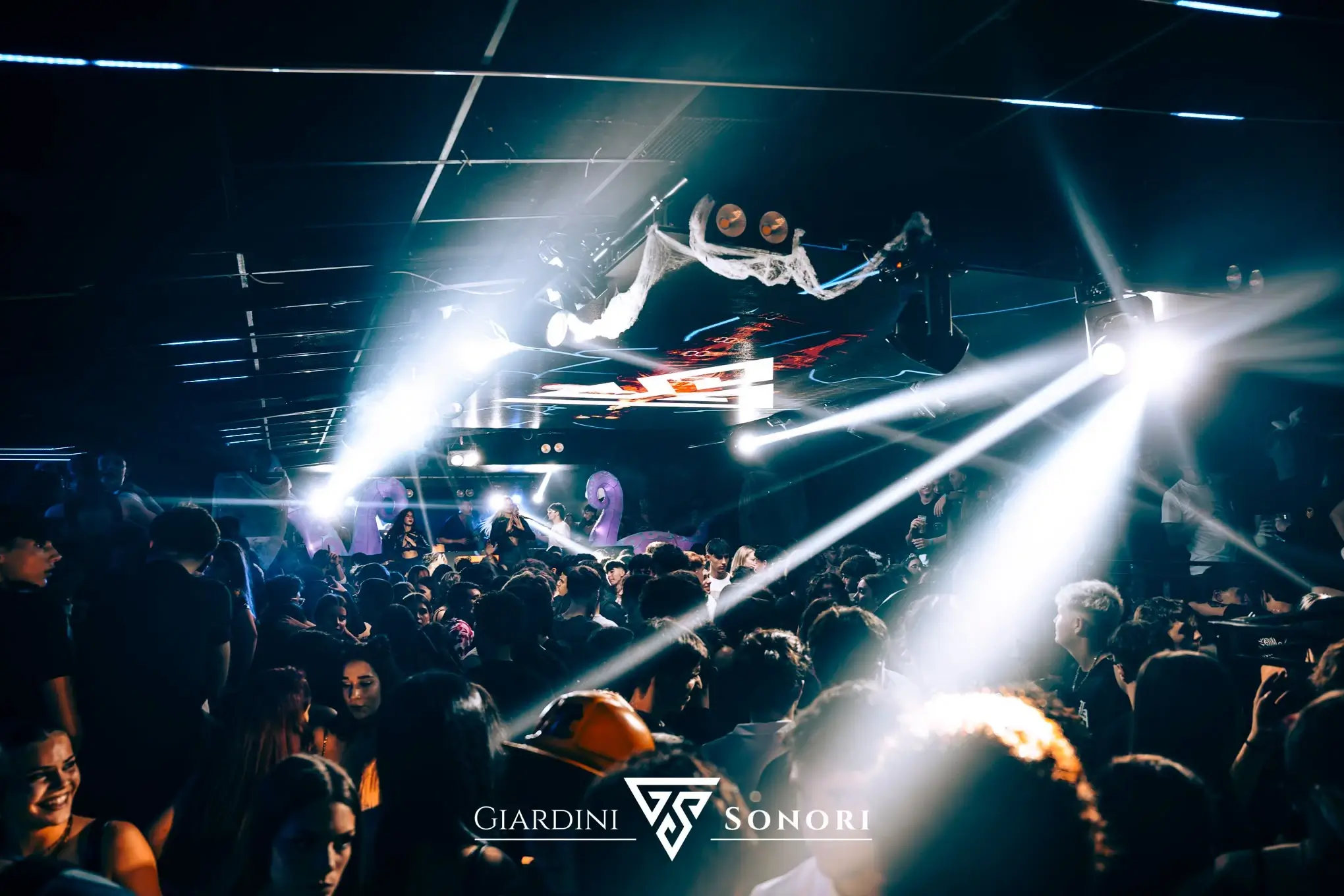 La vera forza dei Giardini Sonori è la sua splendida location, che si esprime al meglio durante la stagione estiva, quando l’ampio giardino esterno diventa il cuore pulsante della festa. La struttura si sviluppa attorno a un’area principale interna e allo spazio all’aperto, trasformandosi in un dancefloor a cielo aperto.